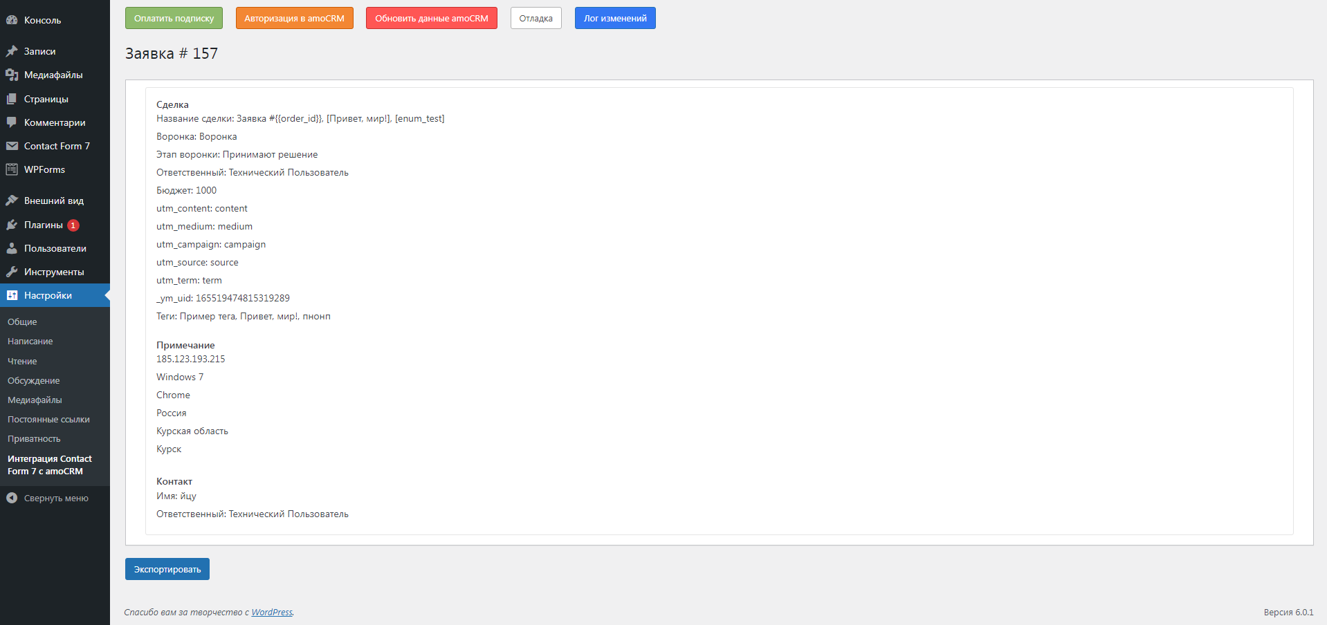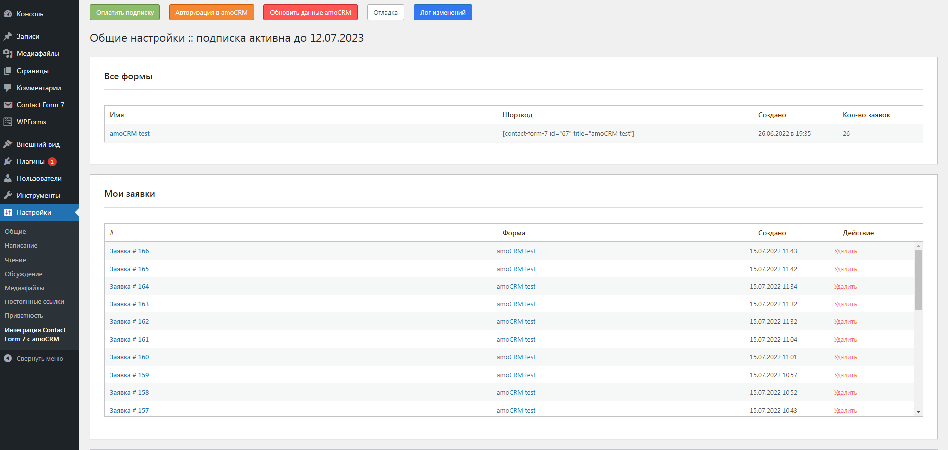 Чтобы заявки не терялись, было принято решение их сохранять прямо в настройках плагина. Вы можете их удалять, просматривать и отправлять повтороно в amoCRM.