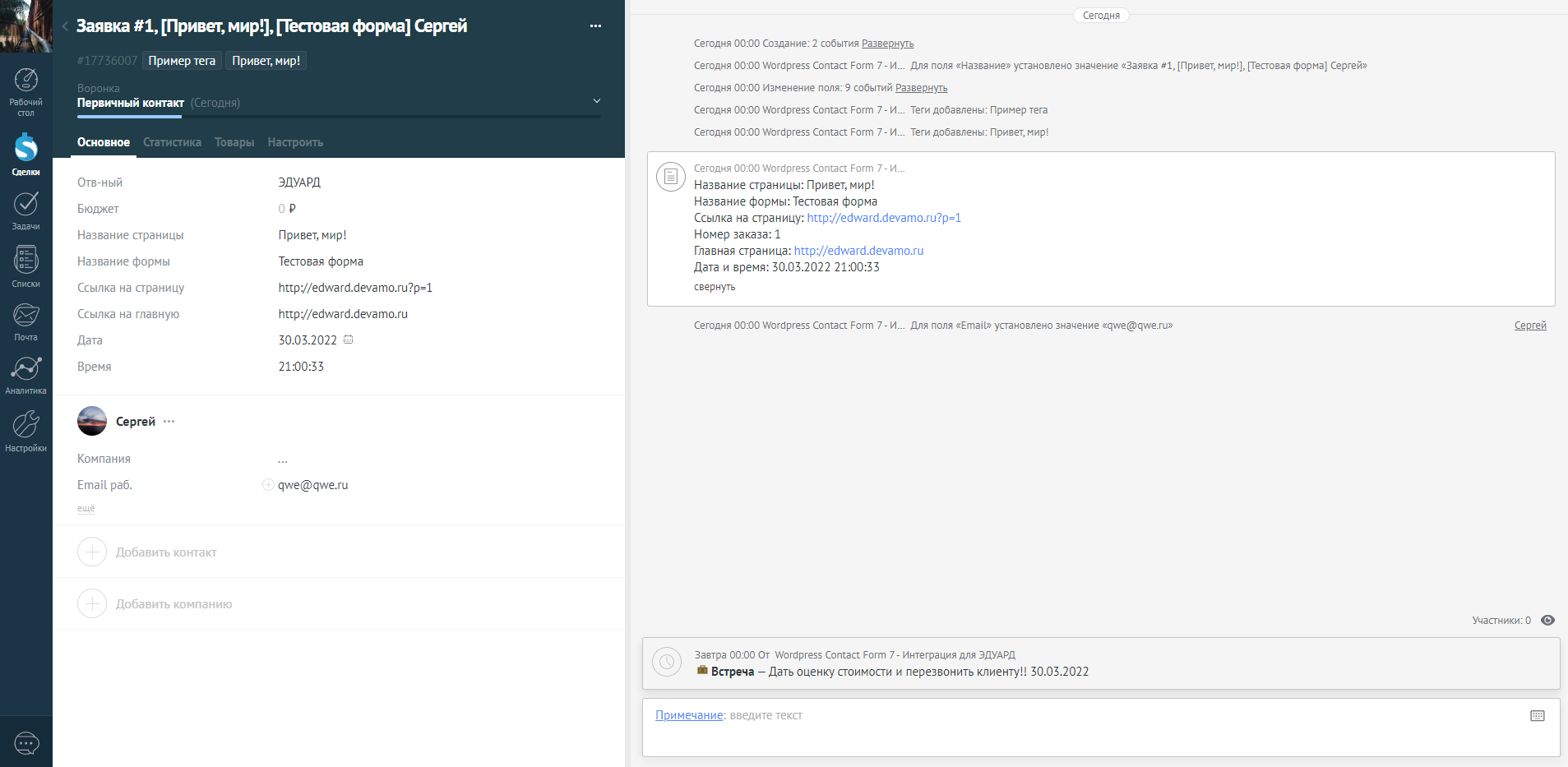 Главным достижением интеграции является полное управление полями формы и передача их в нужные поля неразобранного/сделки, контакта, компании или примечания.