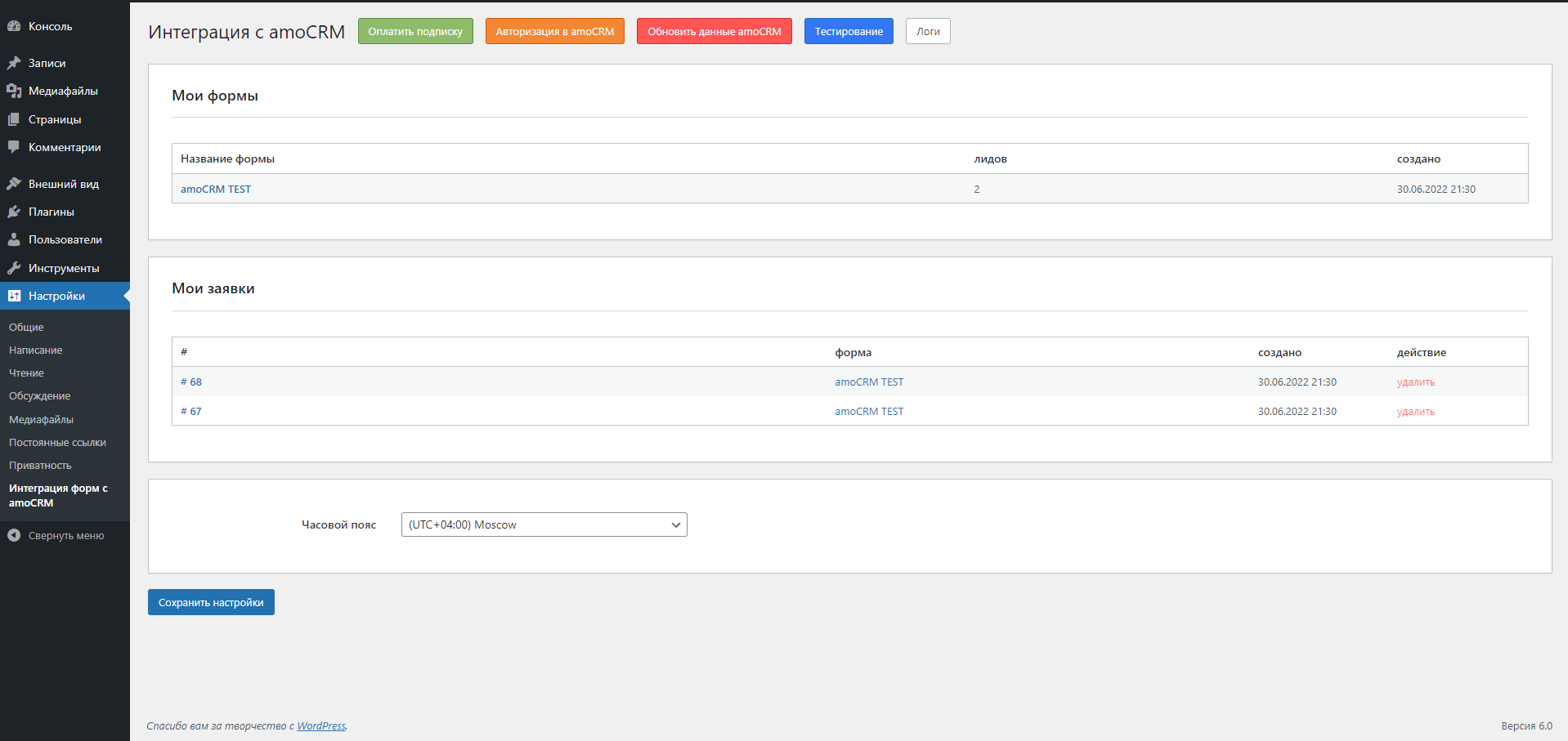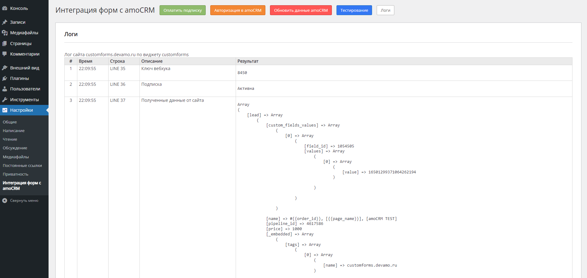 - Скриншоты настроек плагина для интеграции amoCRM с Wordpress формы и переданного заказа в amoCRM
