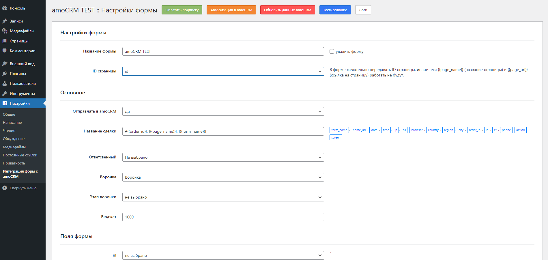 Гланым достиженимем плагина для интеграции amoCRM с Wordpress формы является полное управление полями формы и передача их в нужные поля сделки или контакта.