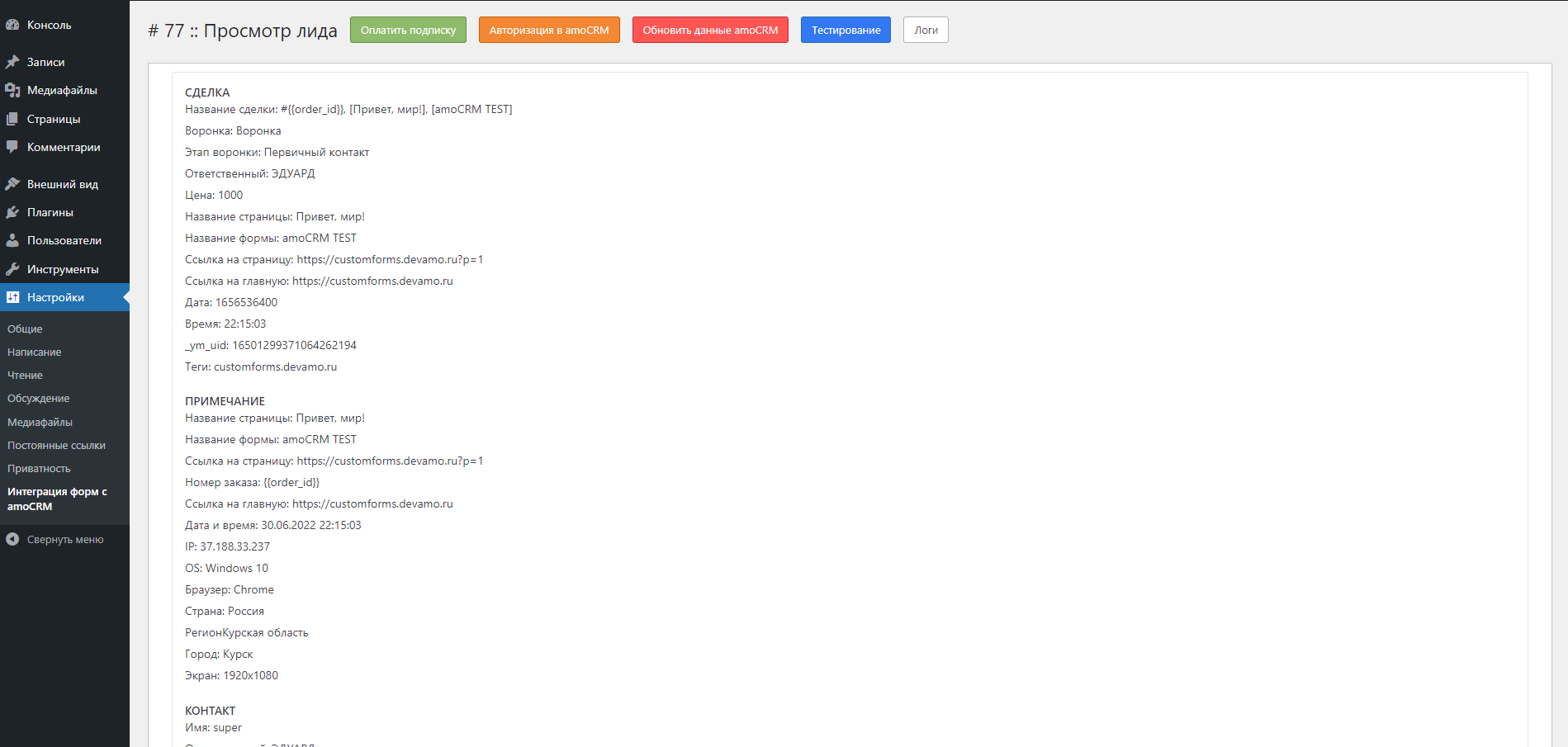 Скриншоты настроек плагина Wordpress формы для интеграции с amoCRM и переданной заявки в amoCRM